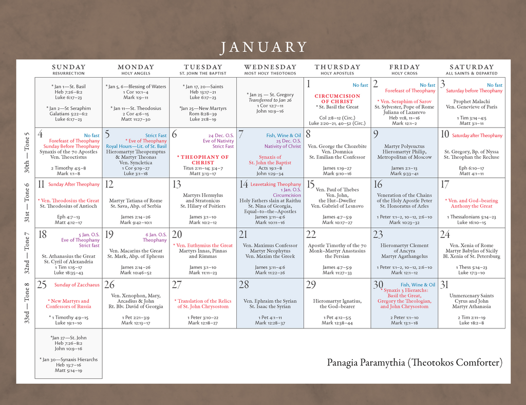 Complete with exhaustive calendar of daily scripture readings, major feasts, commemorated saints, and fasting days.