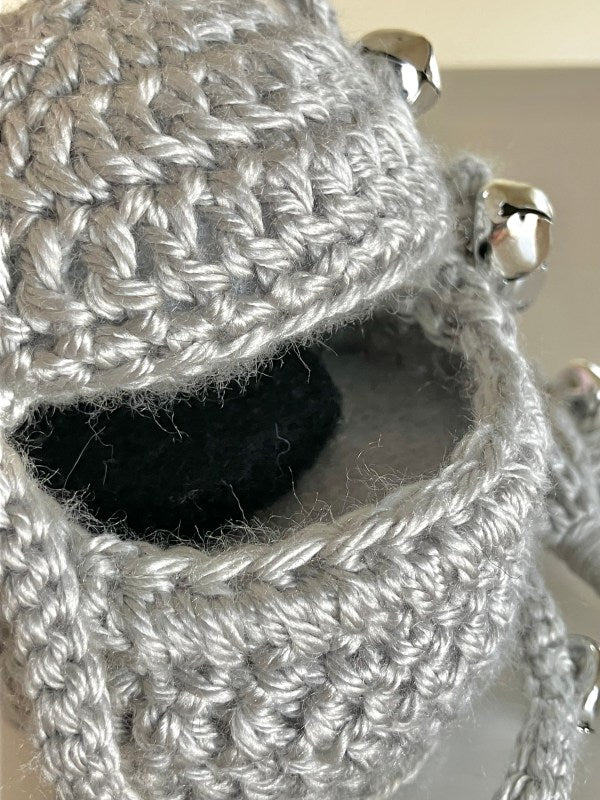 Cozy House Curios is the original home of crocheted toy censers! This unique item is hand-crocheted and both durable and child-friendly. Silver-colored yarn is crocheted around foam hemispheres to hold the shape. The “chains” are crocheted and have minimal stretch. They come together at the top to form a loop convenient for hanging. Twelve silver bells are securely fastened to the four chains. The censer is constructed such that a one-inch space exists between the top and bottom halves. This allows the felted “charcoal” (made from black wool) to be inserted or removed.