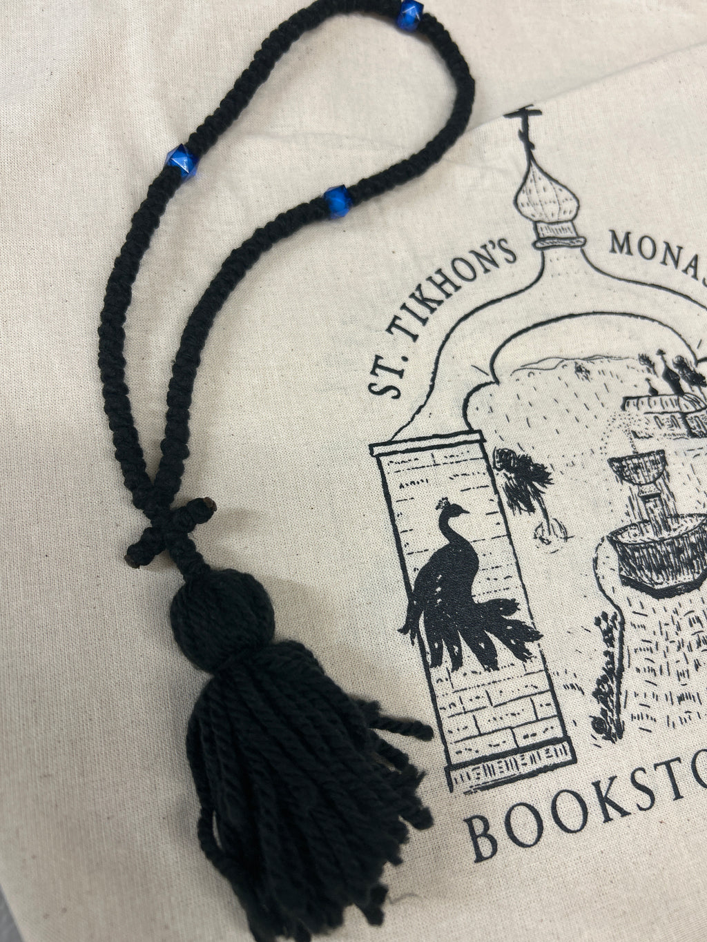This 100-knot Russian-style prayer rope is made with 3-ply yarn, There is a square blue bead after every 25 knots and it is finished with a knotted cross and tassel.
