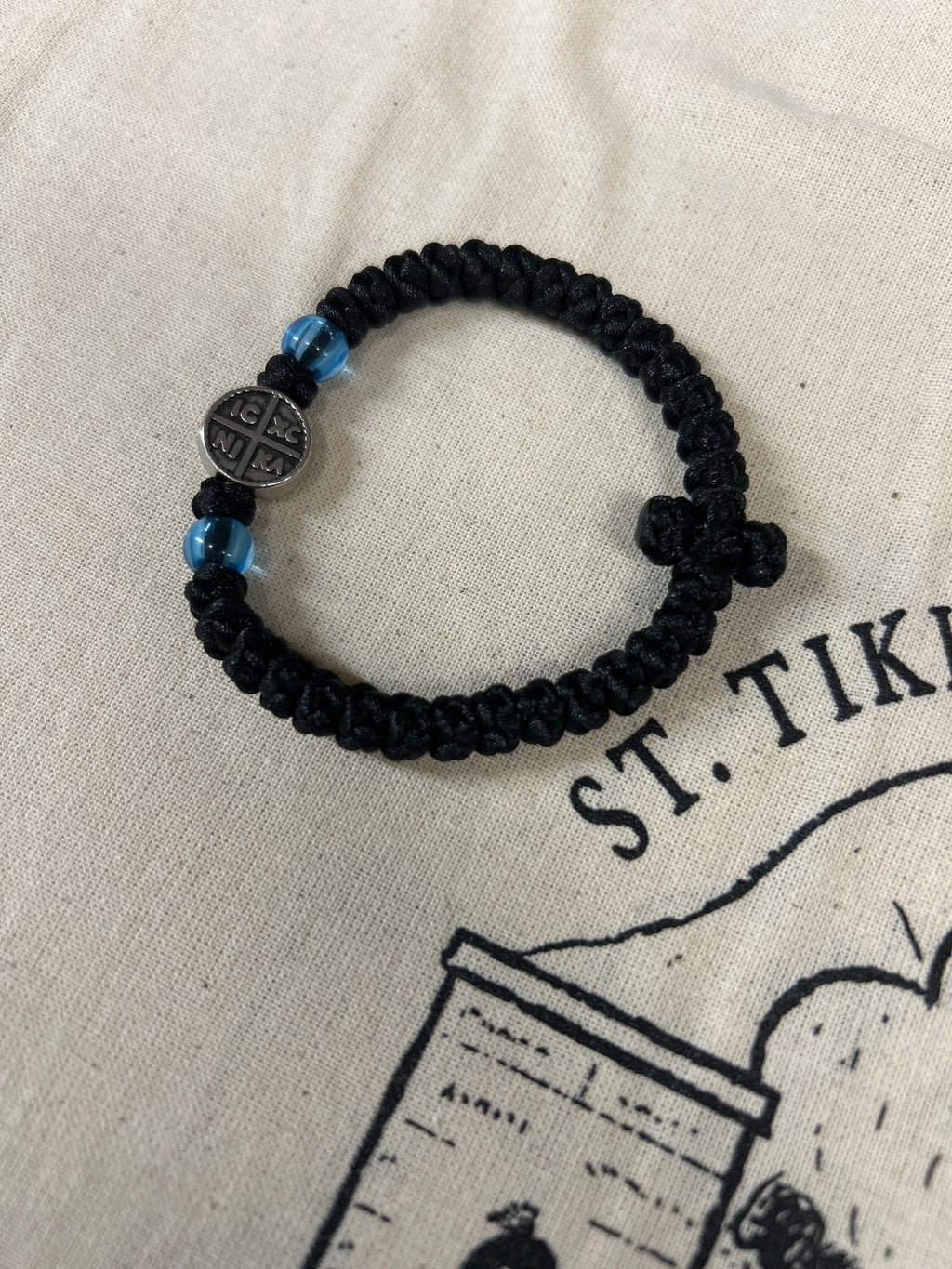 33 knot satin prayer bracelet with blue beads and metal ICXC NIKA accent