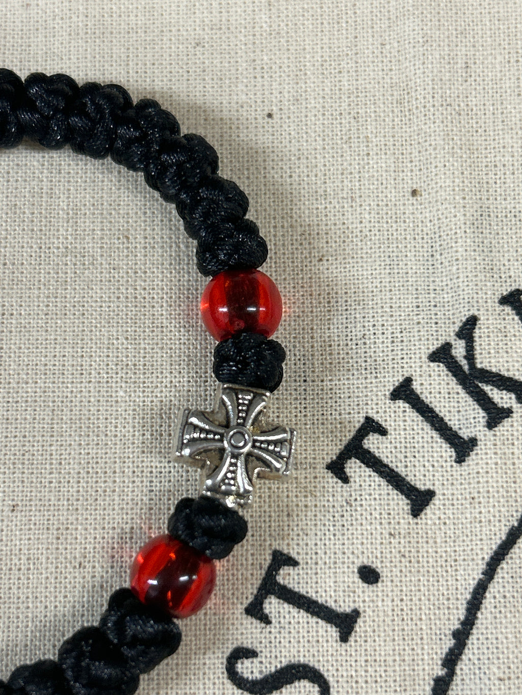 33 Knot Prayer Bracelet with Red Bead and Holy Mother Metal Cross Accent