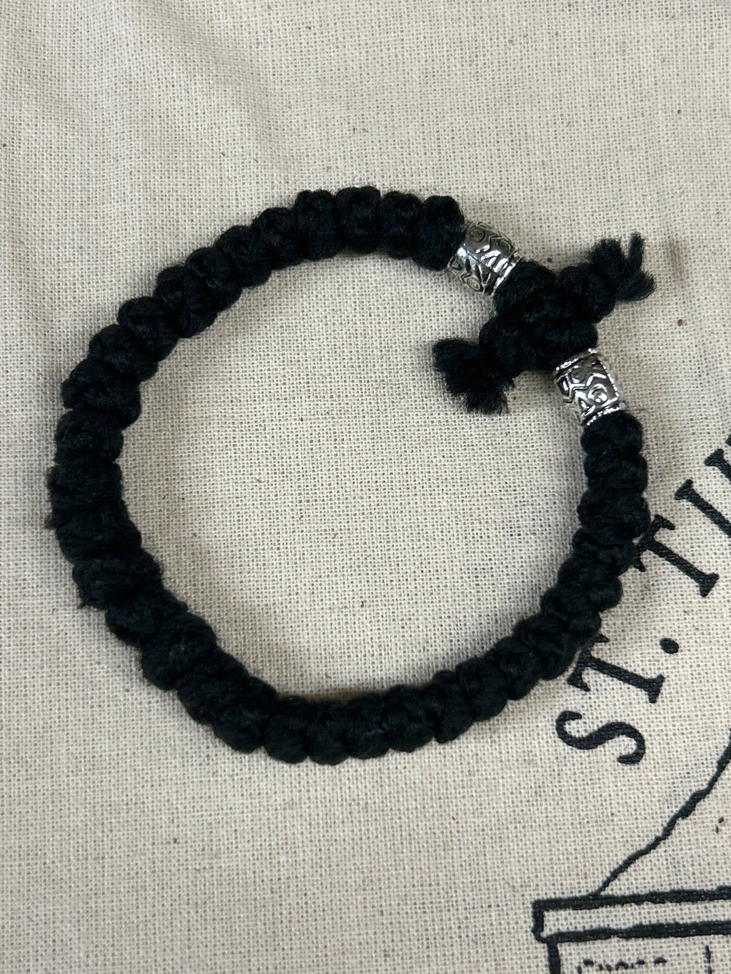 33 knot prayer rope made of 3 ply wool rope. Adorned with 2 silver metal accent beads.