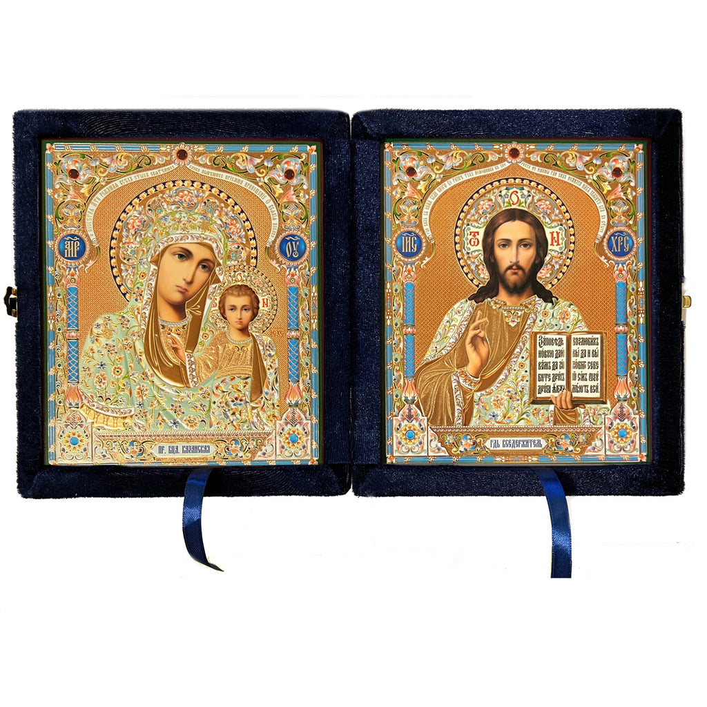 UD-3 Christ the Teacher and Virgin of Kazan Icon Diptych with Blue Velvet Case